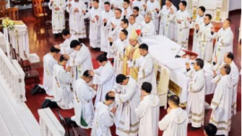 3月25日圣母领报节当天,中国浙江省宁波教区举行了四位新司铎的祝圣仪式。教区司铎们与教区正权主教金主教在圣母升天大教堂共祭。